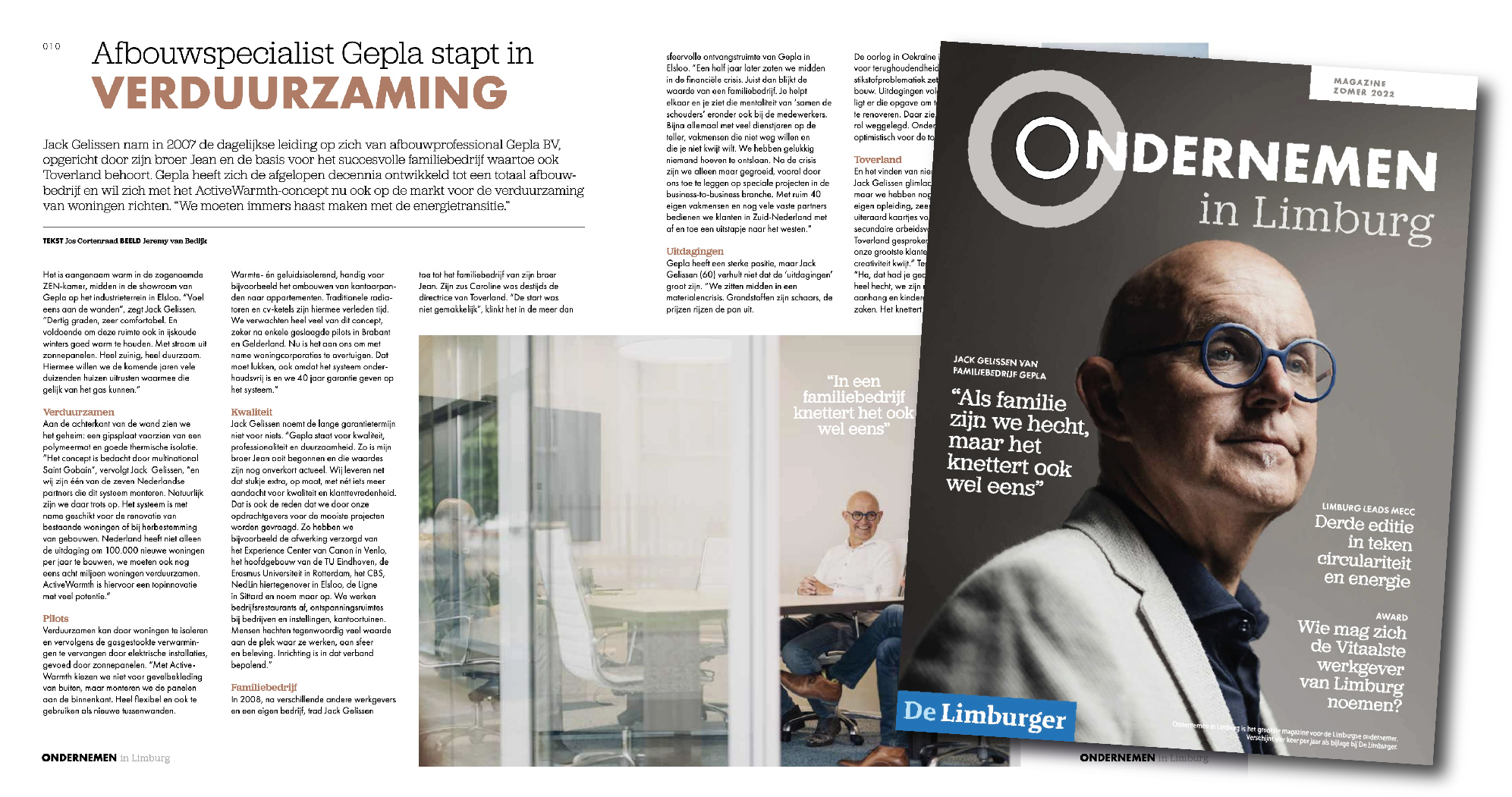 Deze week staat Gepla BV met een interview in het blad Ondernemen in Limburg, dat vier keer per jaar als bijlage van De Limburger wordt uitgegeven. Ook de coverfoto mocht Jack voor zijn rekening nemen. De thema’s van deze editie zijn ‘familiebedrijven’ en ‘innovatie’, beiden op het lijf geschreven van Gepla BV. Jack vertelt over hoe het is om te ondernemen in een familiebedrijf. Tevens komt ons unieke en innovatieve Activewarmth-concept uitgebreid aan bod, waarmee, in combinatie met zonnepanelen, in één klap een enorme stap richting een nul-op-de-meter woning kan worden gezet. Het artikel is hier te downloaden, de volledige uitgave van Ondernemen in Limburg kunt u hier inzien!